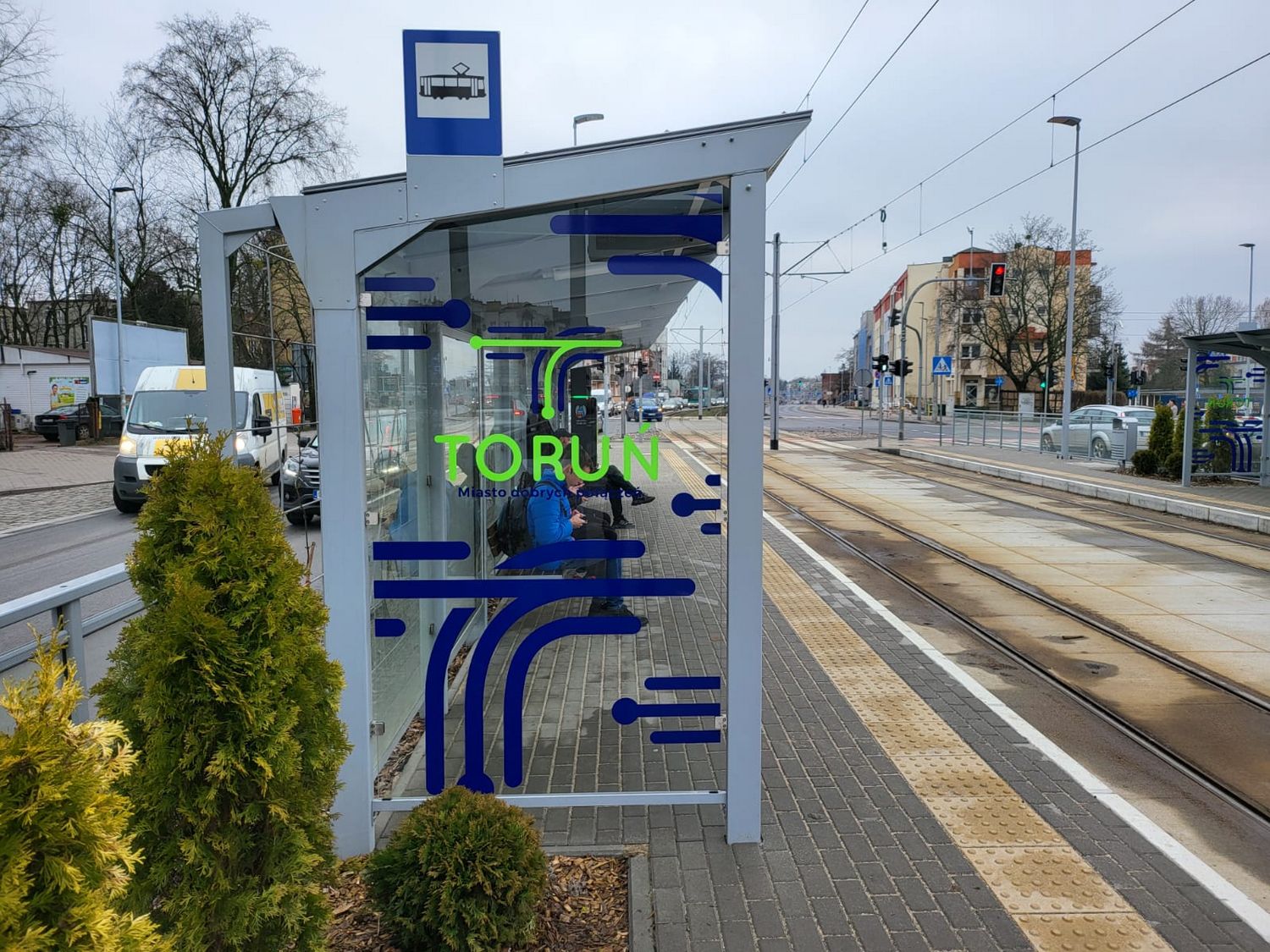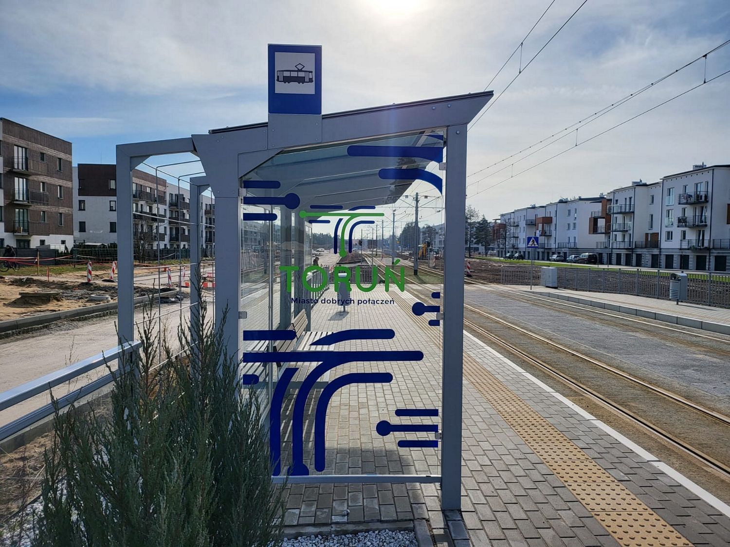 14 wiat wzdłuż nowej linii tramwajowej zostało oklejonych promocyjnymi grafikami Toruń Miasto Dobrych Połączeń