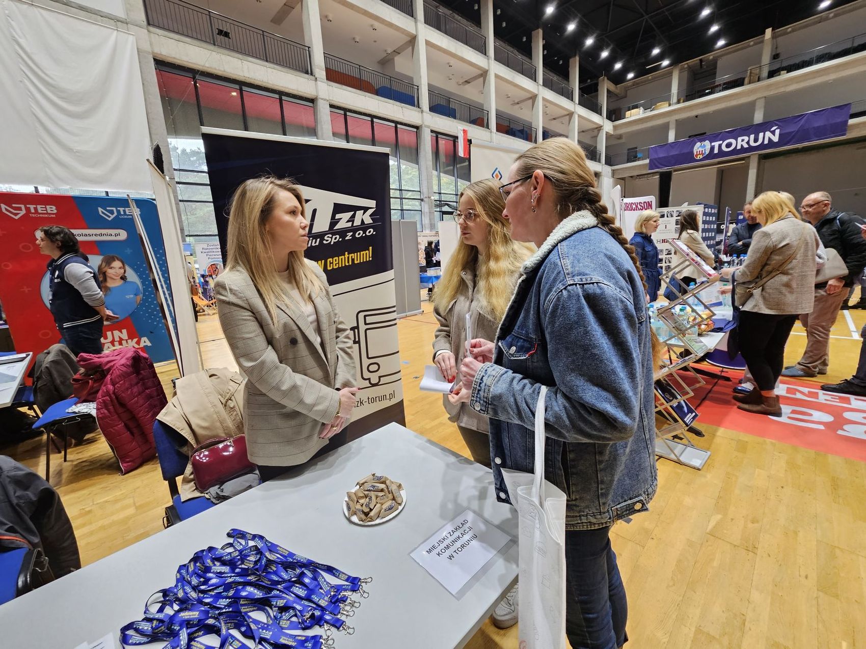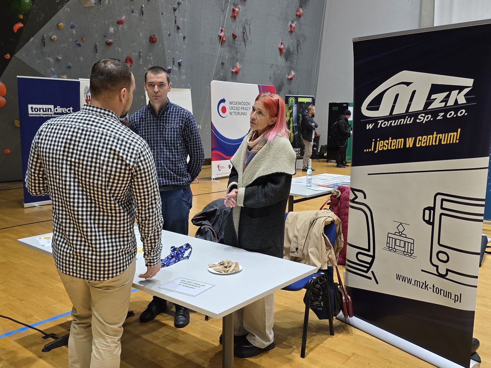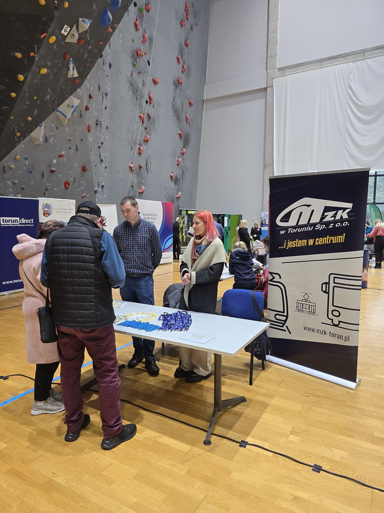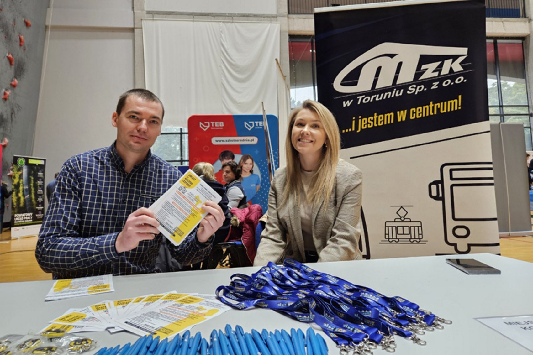 zdjęcie z dwoma pracownikami MZK w Toruniu na stoisku promocyjnym